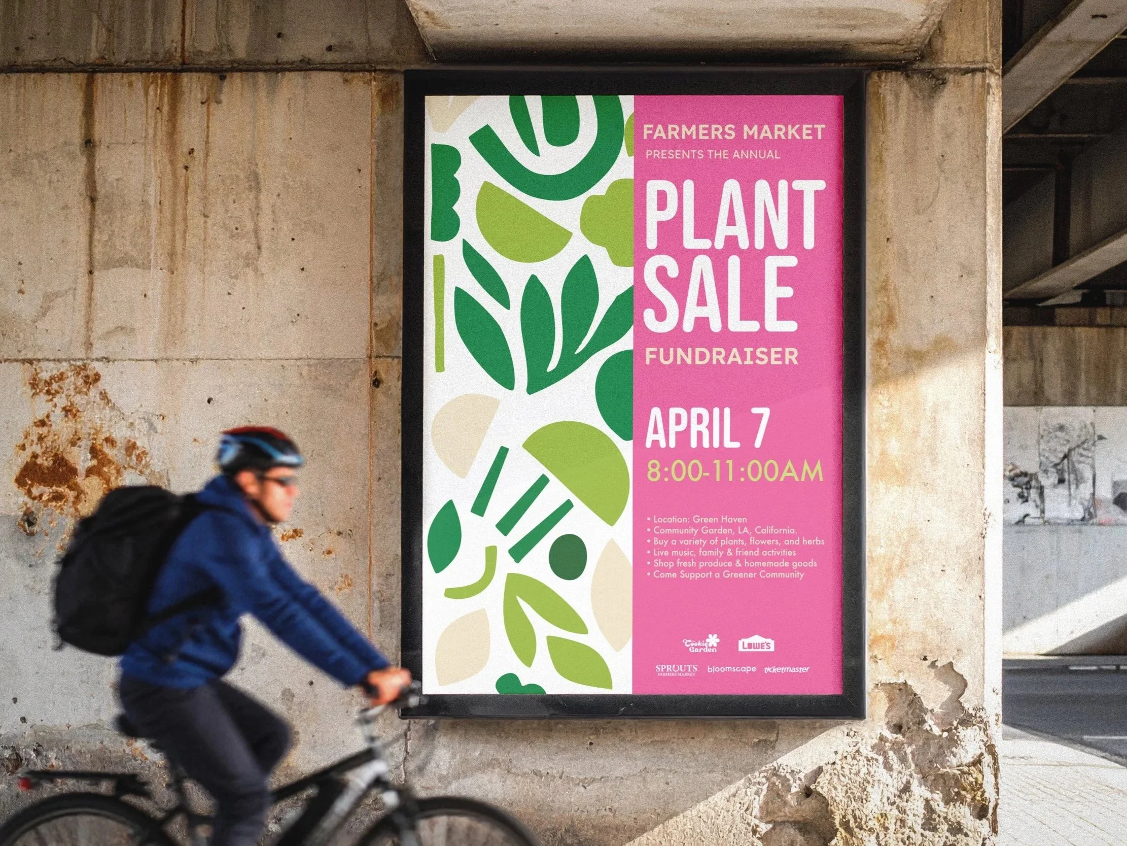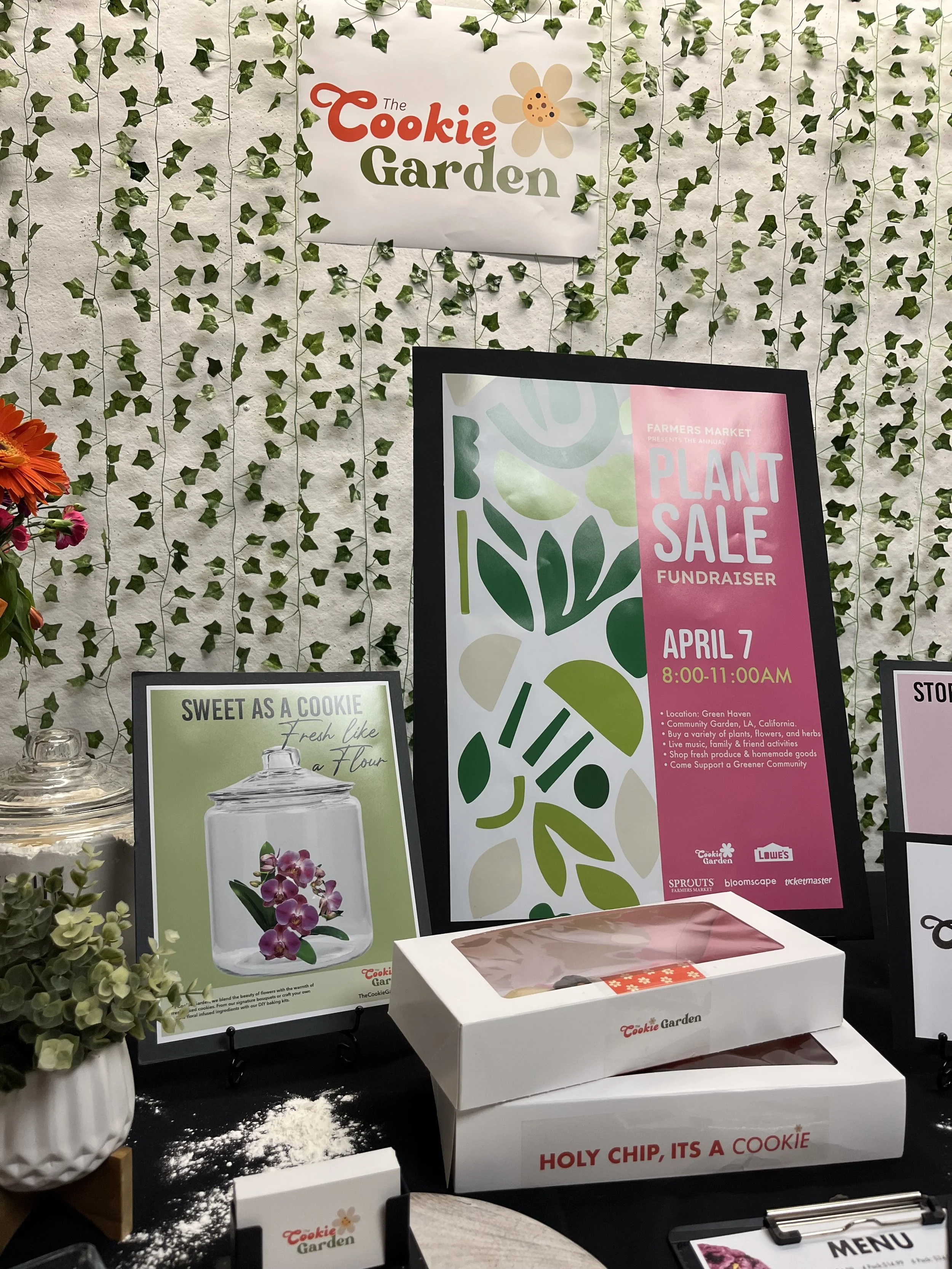 A farmers market theme was chosen to conceptually connect the bakery and florist hybrid, referencing the use of infused flowers as ingredients within the cookies. Organic shapes, high-contrast color blocking, and strong typographic hierarchy were used to create an energetic, community-focused aesthetic while remaining relevant to the brand’s narrative.